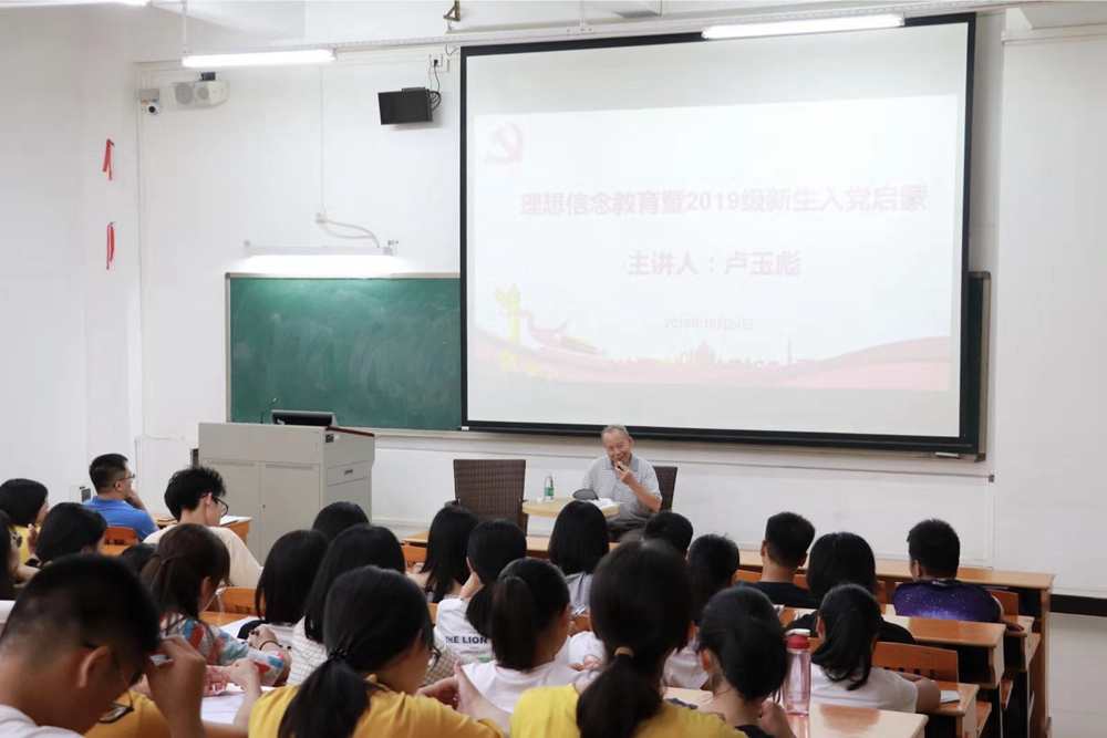 为扎实开展“不忘初心、牢记使命”主题教育,引导2019级员工进一步了解党的历史,加深对党的认识,端正入党动机,坚定共产主义理想信念,10月24日,bv伟德源自英国始于1946在白云校区三教107举办“理想信念教育暨2019级新生入党启蒙”专题讲座,学校关工委委员卢玉彪老师应邀作专题报告,公司党总支书记许建鑫、副书记李雪斌,辅导员伍瑛参加会议。李雪斌主持会议。