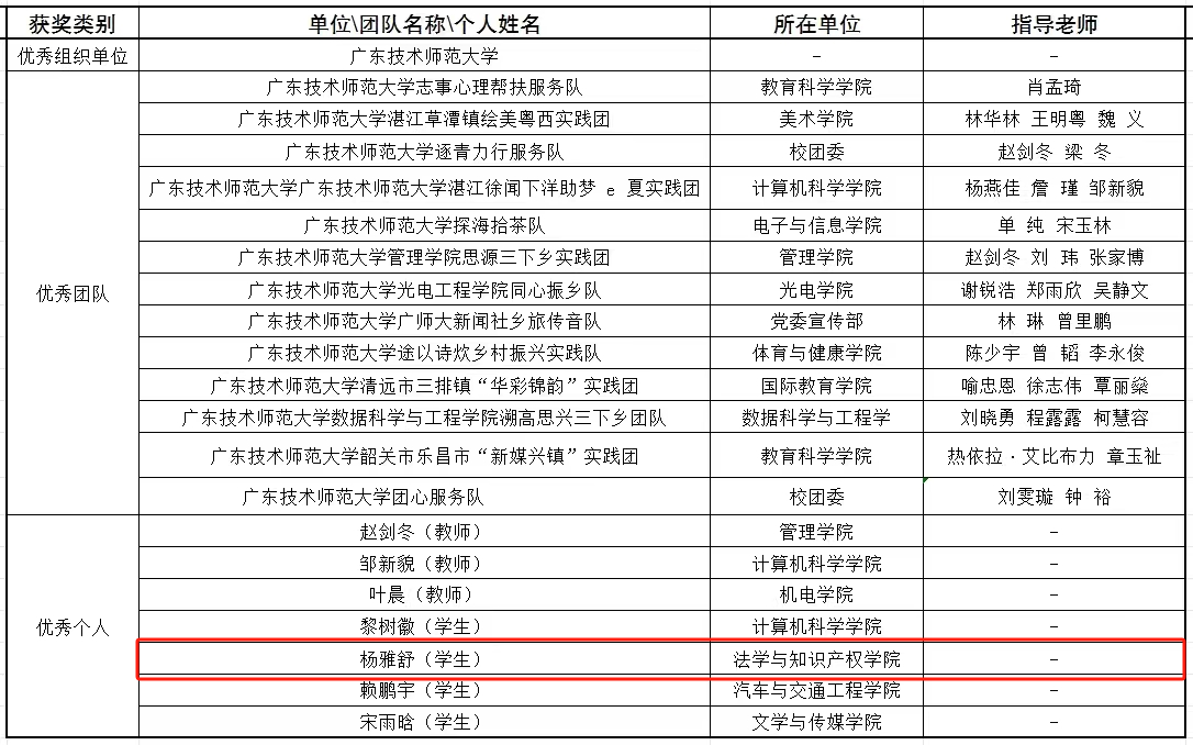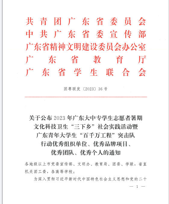 近日,广东团省委发布了《关于公布2023年广东大中专员工志愿者暑期文化科技卫生“三下乡”社会实践活动暨广东青年老员工“百千万工程”突击队行动优秀组织单位、优秀品牌项目、优秀团队、优秀个人的通知》。公司员工杨雅舒荣获优秀个人称号。