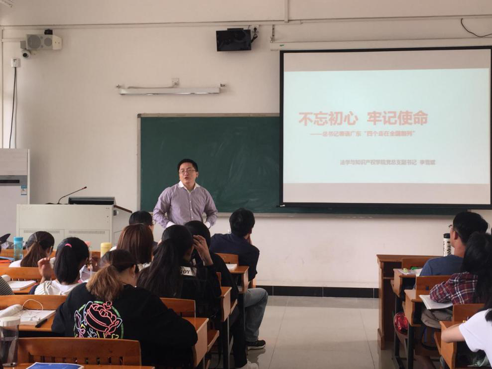 3月28日,公司党总支李雪斌副书记在三教315室给16法学2班全体同学上了“思政第一课”,题目是《不忘初心、牢记使命——习近平总书记寄语广东“四个走在全国前列”》,班主任喻乐云老师以及辅导员梁妙娟老师进行了旁听。
